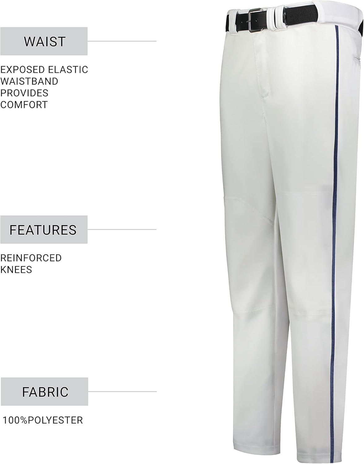 Sprint to first base in the Piped Change Up Baseball Pant from Russell Athletic®. Featuring 11 ounce, 100% polyester stretch double knit with stain release and silicone knitted elastic waistband with tunnel belt loops. These baseball pants will keep you comfortable on the field, inning after inning.