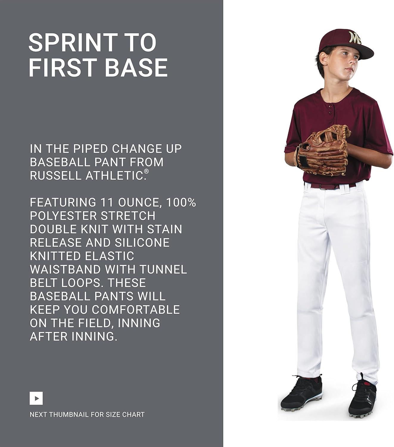 Sprint to first base in the Piped Change Up Baseball Pant from Russell Athletic®. Featuring 11 ounce, 100% polyester stretch double knit with stain release and silicone knitted elastic waistband with tunnel belt loops. These baseball pants will keep you comfortable on the field, inning after inning.