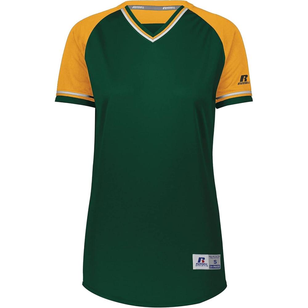 Russell Athletic Womens Women’s V-Neck Softball Jersey – Short Sleeve Moisture-Wicking Tee – Classic Athletic Wear(Dark Green/Gold/White)